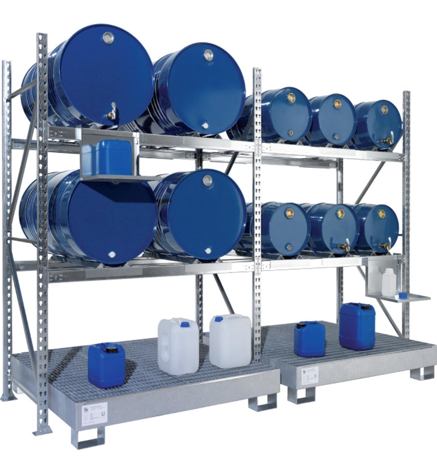 Thermisch verzinkte vatenstelling met opvangbak voor het horizontaal opslaan en aftappen van verschillende typen stalen vaten. Speciaal geschikt voor de liggende opslag van 60 en 200 liter vaten. Opslag van losse verpakkingen is ook mogelijk op het rooster van de opvangbak. Draagvermogen per liggerpaar is 600 kg. Basis- en aanbouwsegmenten zijn willekeurig met elkaar te combineren.