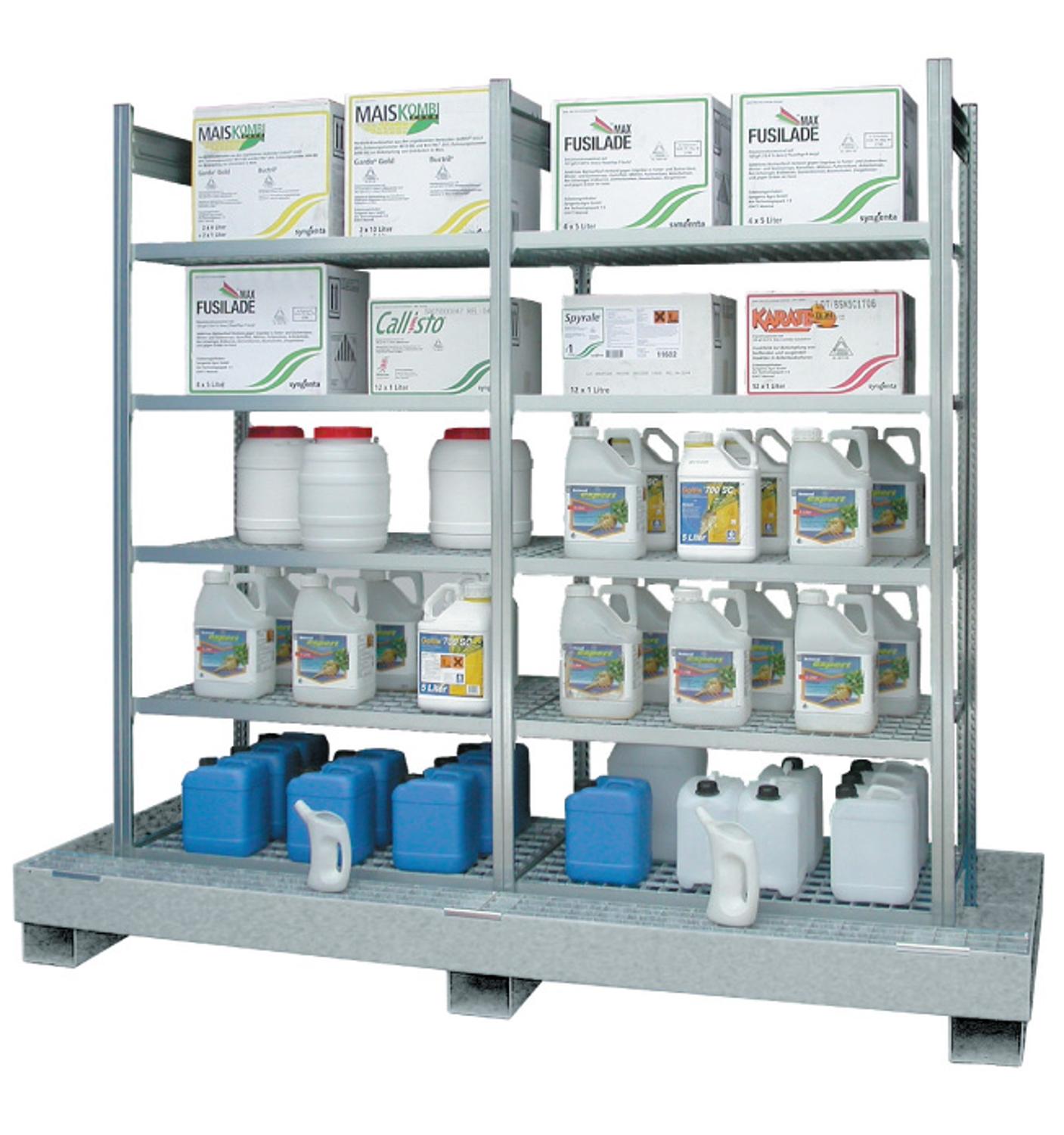 Staal verzinkte stelling met stalen gelakte opvangbak. Groot opvangvolume door de combinatie van bodemopvangbak en opslagstelling. De opslagstelling GR2-5GE heeft een stellingdiepte van 600 mm. Verzinkte roosterlegborden vormen de opslagniveaus. Speciaal ontwikkeld voor de opslag van ADR klasse 8 en 9, olieproducten, gewasbeschermingsmiddelen en biociden. De opslagstelling is voorzien van 5 opstelniveaus voor een totale segmentlast van maximaal 2.000 kg. Draagvermogen per legbord is 200 kg bij een gelijkmatig verdeelde last. De levering van de basisstelling bestaat uit; 3 staanderframes, 2 x 5 geperforeerde legborden en 1 bodemopvangbak met opstelrooster.