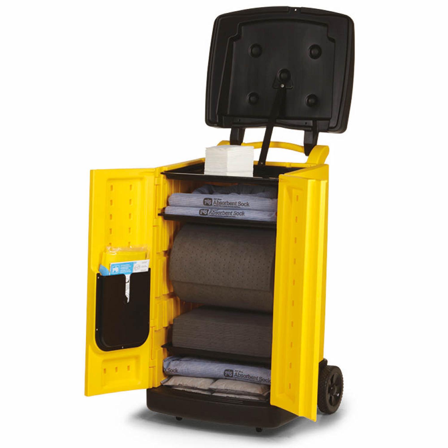 Goed zichtbare felgele spill caddy met klapdeuren voor eenvoudige toegang tot de absorptiemiddelen. Komt met een gemonteerde mattenrol, voor het eenvoudig afscheuren van de benodigde matten. De spill caddy heeft soepele wielen van 20 cm en extra zwenkwielen voor draaien zonder te kantelen, verstelbare planken en kan afgesloten worden middels een slot. Absorbeert tot 190 liter.