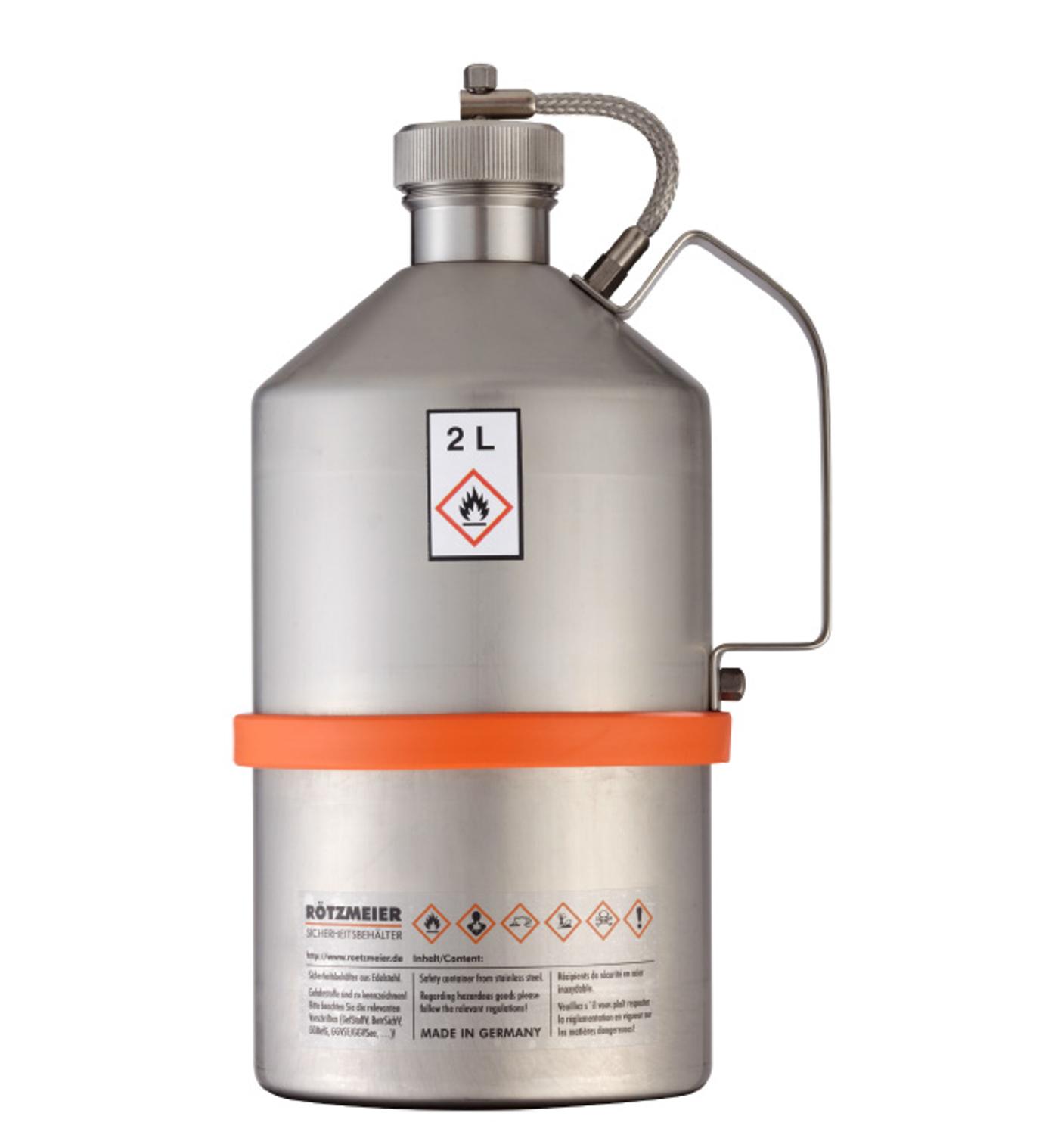 Veiligheids transportkannen van hoogwaardig en chemisch bestendig RVS 1.4404 (316) met een dikte van 0,6 mm. Ontwerp goedgekeurd door het Federaal Instituut voor Materiaalonderzoek en Testen van Duitsland (BAM) voor UN-transport van alle soorten gevaarlijke goederen (verpakkingsgroep X) volgens ADR, RID, IMDG Code, GGVSEB en GGVSee. Gebruik de transportkan voor het veilig vervoeren van brandbare vloeistoffen.