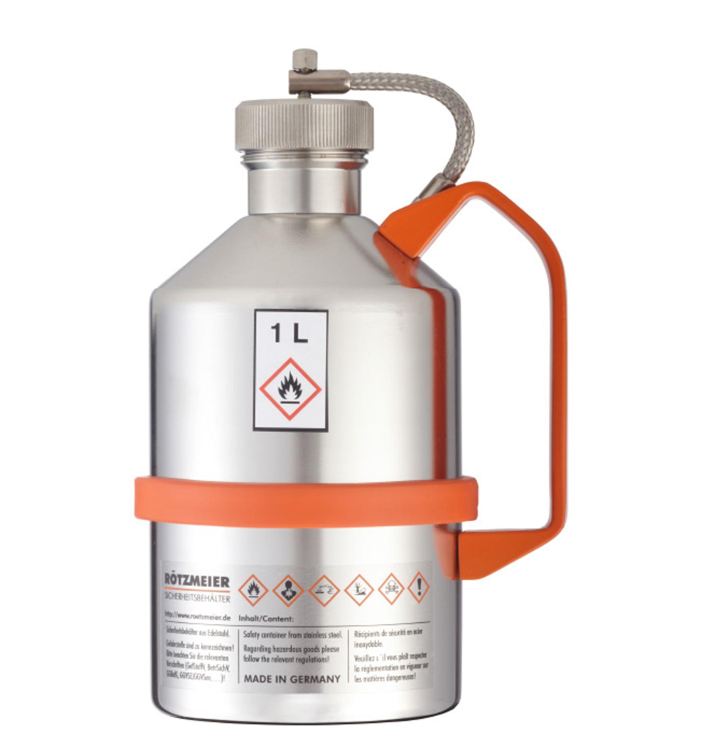 Veiligheidskannen van hoogwaardig en chemisch bestendig RVS 1.4404 (316) met een dikte van 0,6 mm, aluminium handvaten met oranje poedercoating. De veiligheidskannen hebben een gepolijse afwerking. Gebruik de kannen voor het veilig opslaan, vullen en doseren van chemische vloeistoffen in laboratoria.