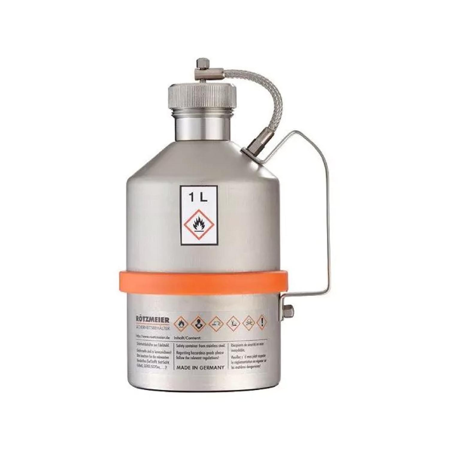 Ongepolijste RVS veiligheidskannen voorzien van een uitneembaar vlamscherm in de vulopening. Drukregelventiel in de zelfsluitende fijndoseerkranen en de schroefdoppen (ontlucht vanaf ca. 0,3 bar) met afdichting van Teflon (PTFE). De veiligheidskannen zijn getetst op lekkage bij 0,4 bar. Keuze uit uitvoering met fijndoseerkraan of met een schroefdop.