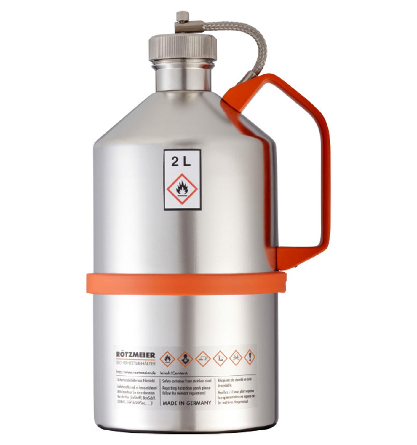 Veiligheidskannen van hoogwaardig en chemisch bestendig RVS 1.4404 (316) met een dikte van 0,6 mm, aluminium handvaten met oranje poedercoating. De veiligheidskannen hebben een gepolijse afwerking. Gebruik de kannen voor het veilig opslaan, vullen en doseren van chemische vloeistoffen in laboratoria.