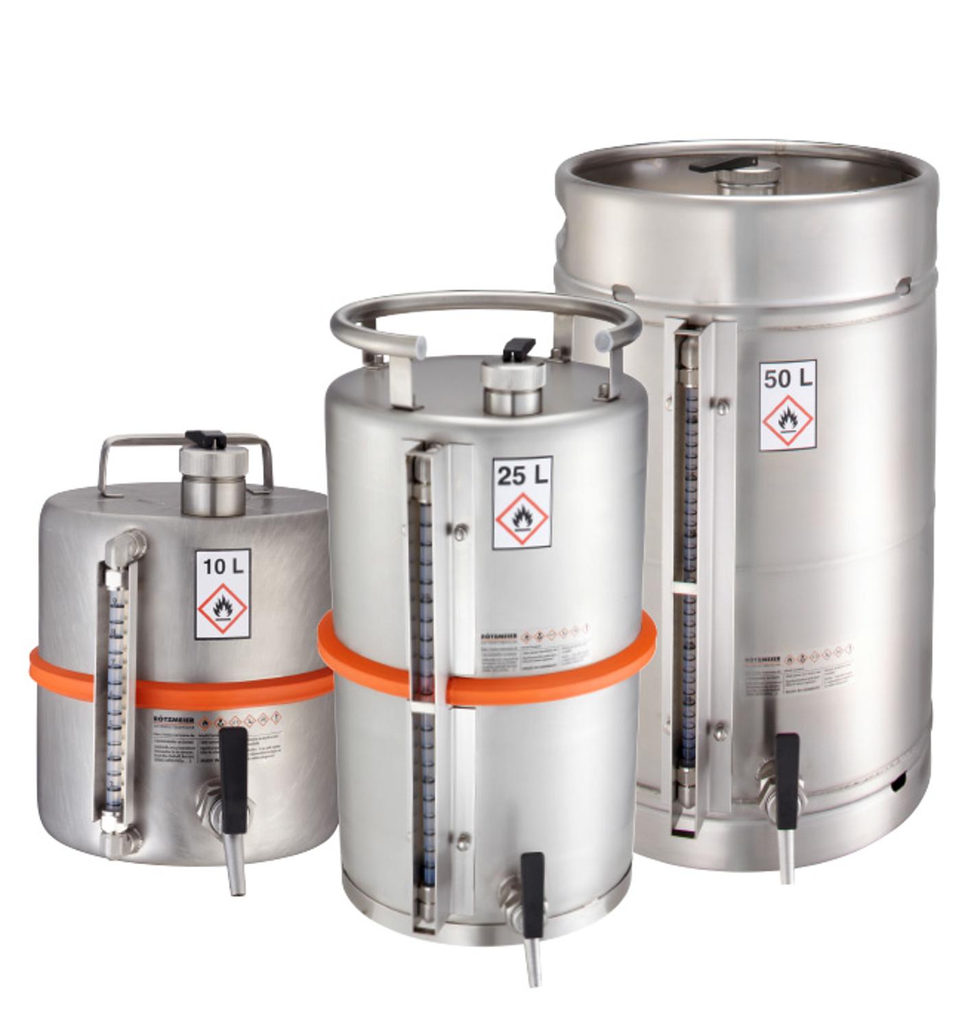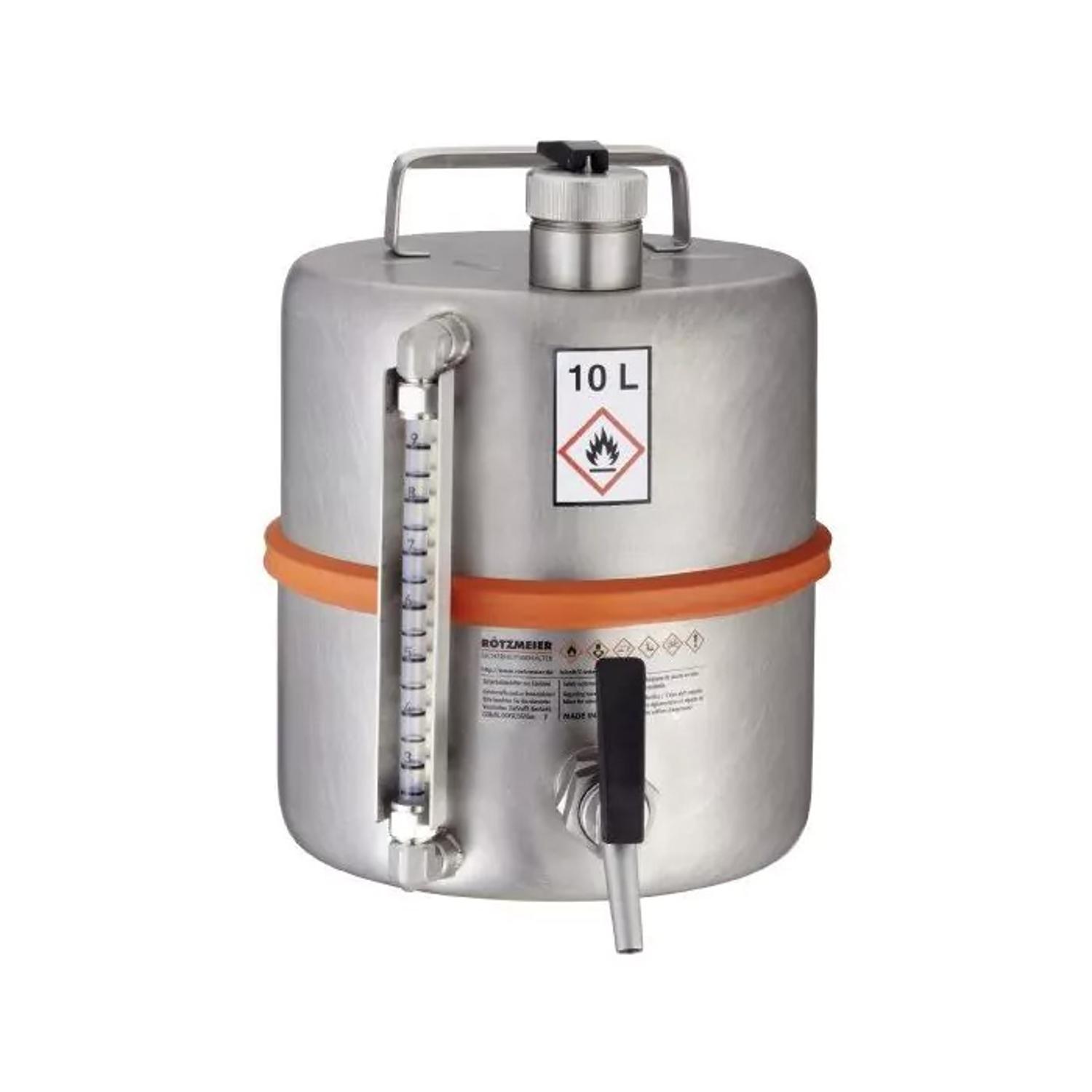 Ongepolijst RVS veiligheidsvaten met uitneembaar vlamscherm in de vulopening. Zelfsluitende kraan, de opening zit iets boven de bodem van het vat. Kunststof hendel op schroefdop verstelbaar voor permanente ventilatie. Peilglas (schokbestendige buis van PFA-Teflon) biedt optische niveaucontrole tijdens het vullen en doseren. Uitgevoerd met massieve RVS handgrepen en een drukregelventiel in de tapkraan, vacuumcompensatie 0,3 bar. De veiligheidsvaten zijn getest op lekkage bij 0,4 bar. Veiligheidsvaten voor het veilig opslaan, verdelen en intern transporteren van brandbare vloeistoffen.