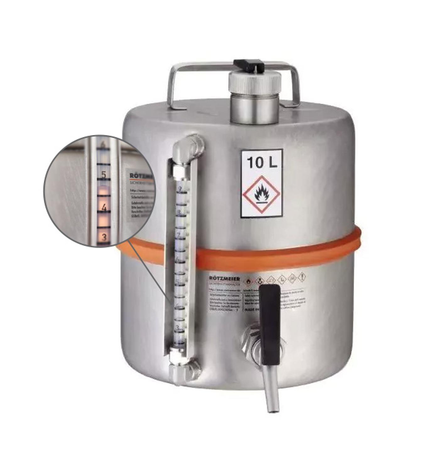 De veiligheidsvaten met een inhoud van 10 liter van hoogwaardig en chemisch bestendig RVS 1.4404 (316), de 25 en 50 liter veiligheidsvaten zijn gemaakt van RVS 1.4301 (304) met een dikte van 0,8 tot 1,5 mm. De veiligheidsvaten hebben een ongepolijse afwerking. Gebruik de veiligheidsvaten voor het veilig opslaan van grote hoeveelheden brandbare vloeistoffen.