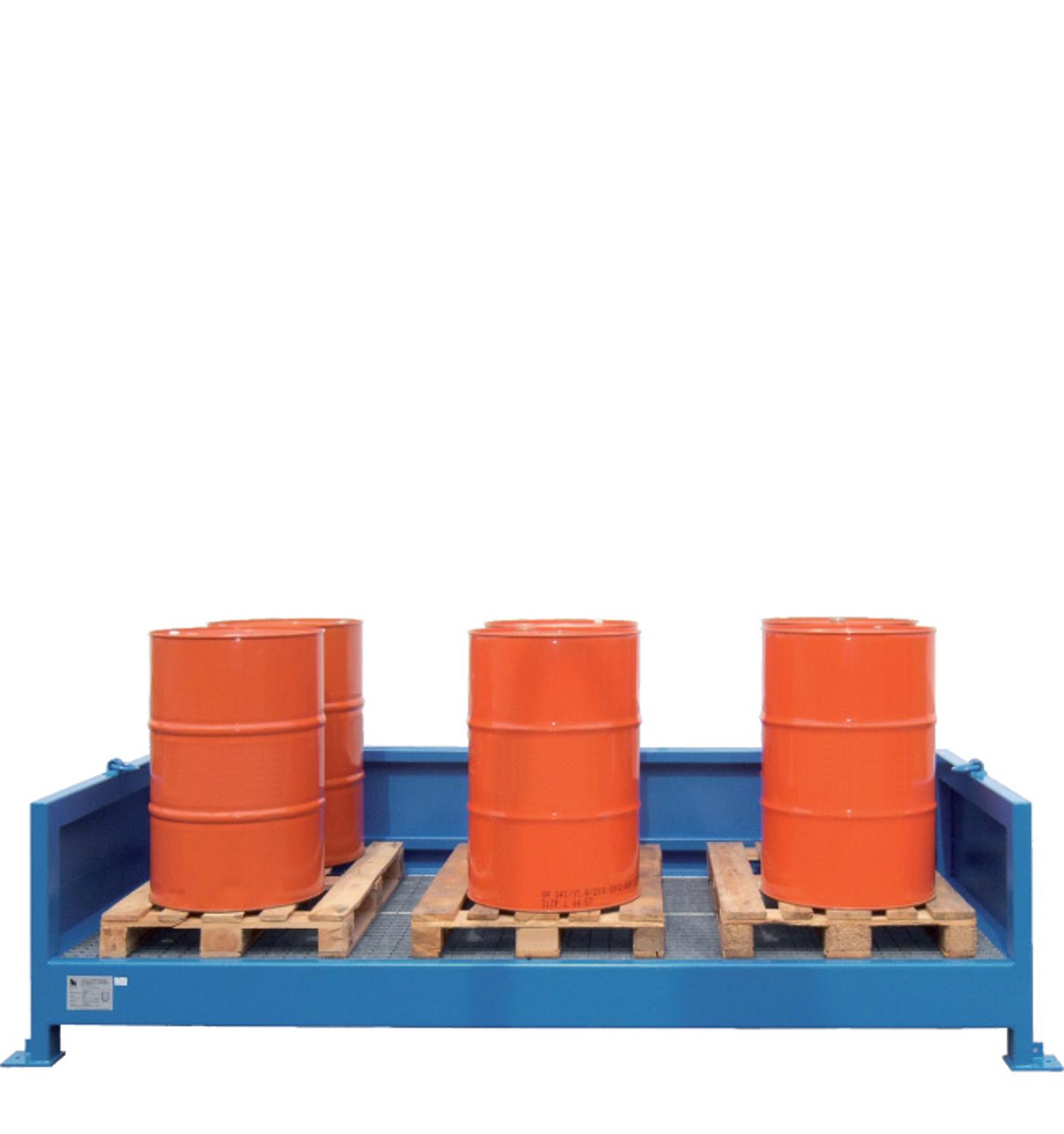 Capaciteit 200 liter vaten: 10 stuks direct op rooster of 8 stuks op chemiepallet of 6 stuks op Europallet