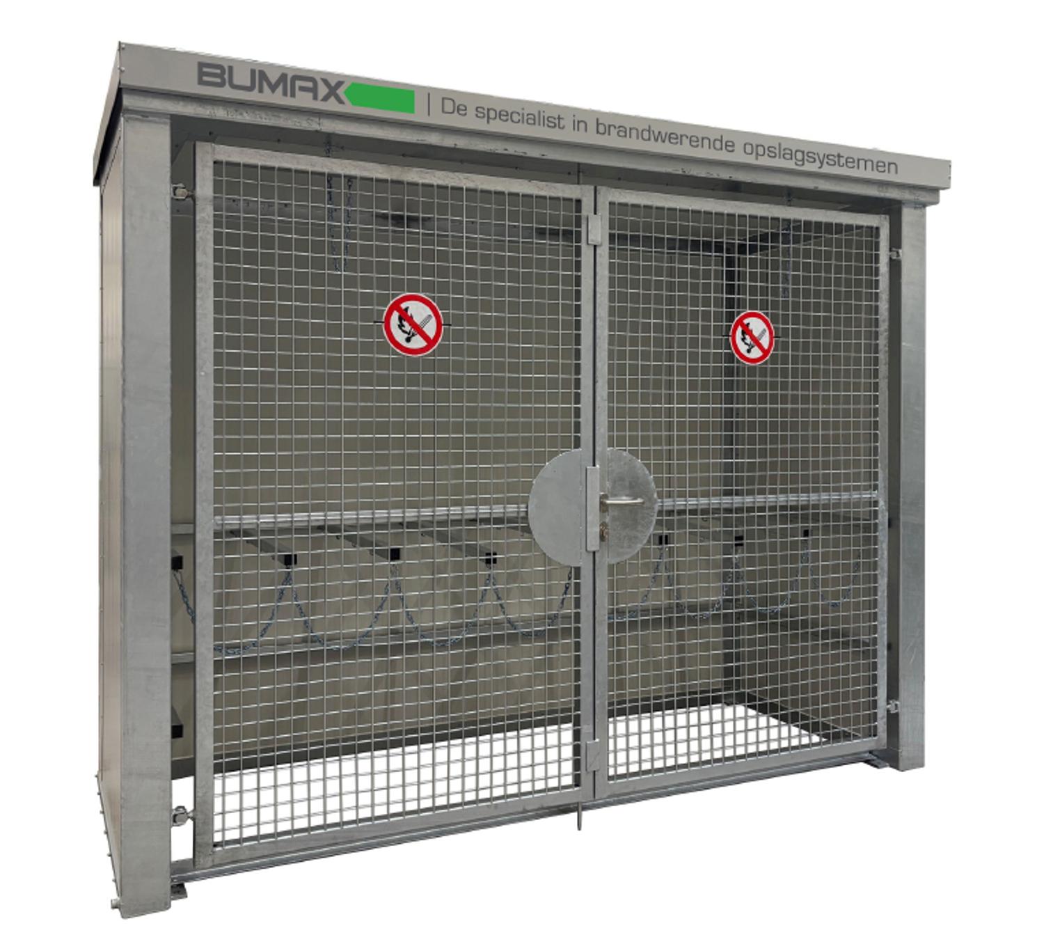 De brandwerende gasflessenberging is geschikt voor uitpandige opslag van gascilinders volgens de PGS 15:2025. De BUMAX X90 brandwerende gasberging wordt volledig gemonteerd geleverd en wij adviseren om deze te verankeren aan de bodem. Voor een goede werking van het opslagsysteem is het van belang dat deze wordt geplaatst op een vlakke waterpas ondergrond bijvoorbeeld stelconplaten of betonnen vloer.