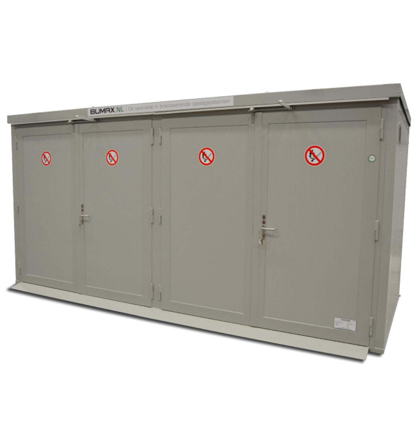De brandwerende dubbele deuren hebben de classificatie EI 1 90 en voldoen aan de allerhoogste brandnorm in Europa. BUMAX produceert deze branddeuren in eigen fabriek in Zwijndrecht, waar ook de brandwerende gasbergingen geproduceerd worden. De dubbele deur heeft een dagmaat van maar liefst 2.130 x 2.350 mm. Daarnaast is de deur in een geopende stand vast te zetten en sluit automatisch bij brand. De brandwerende container is afsluitbaar voor onbevoegden en te allen tijde vanaf de binnenzijde te openen. RVS deurbeslag, hoogwaardig slot en smeerbare scharnieren dragen bij aan de hoogstaande kwaliteit die je van BUMAX mag verwachten. De voorbereiding voor een oprijplaat is standaard voorzien waarbij de functie van de brandwerende deur blijft gewaarborgd.