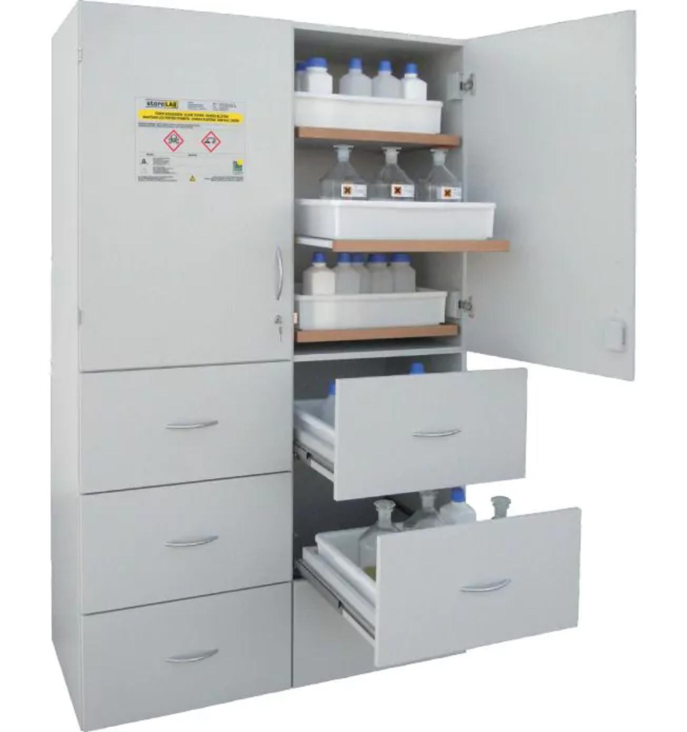 De zuren- en logenkast SLS 1200 is speciaal ontwikkeld voor de gescheiden opslag van zuren en logen conform de PGS 15, het interieur van de milieukast is bestendig tegen de inwerking van de zuren en logen en bestaat uit 4 of 6 uittrekbare legborden en 6 schuifladen.
