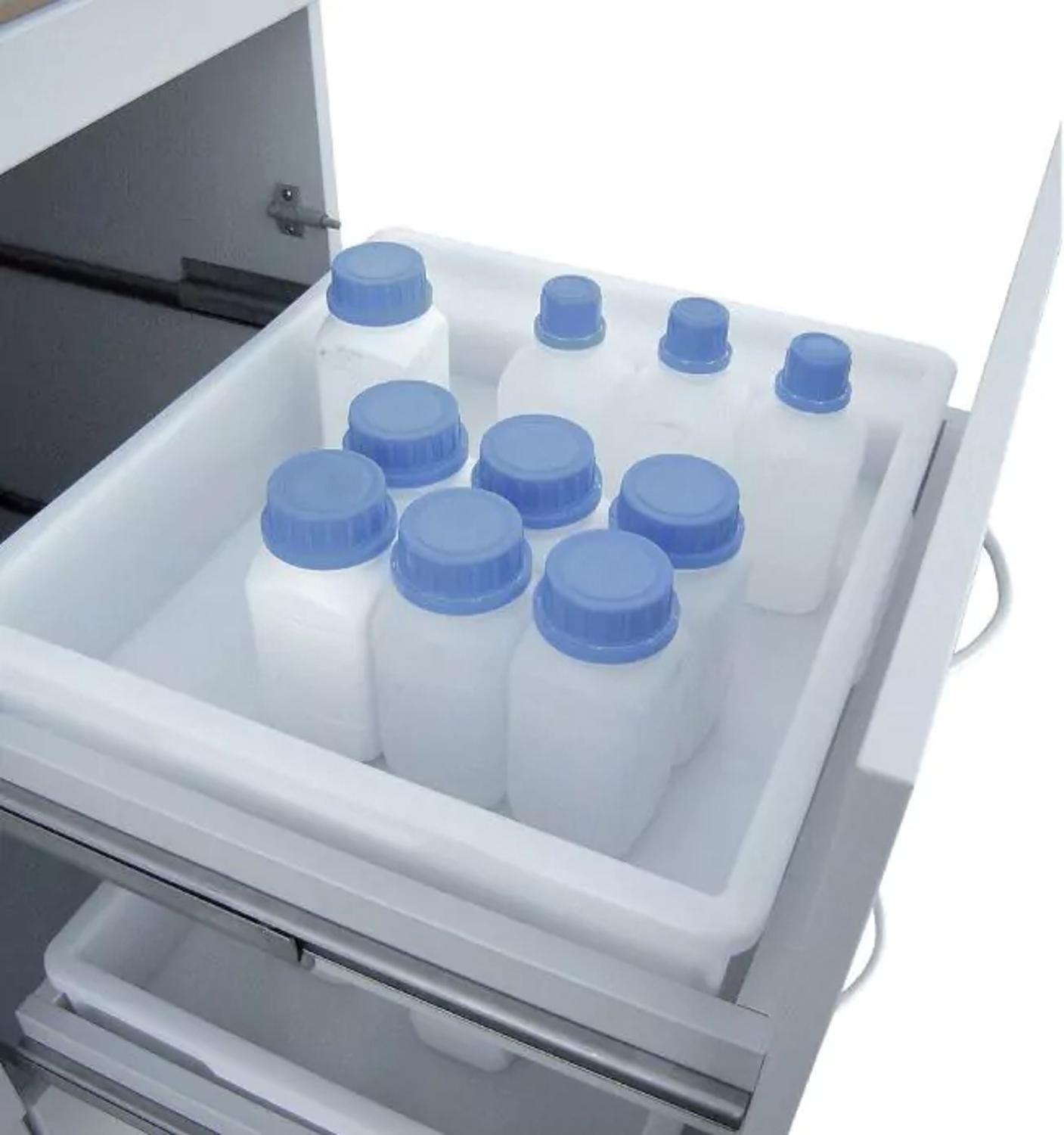 De zuren- en logenkast SLS 1200 is speciaal ontwikkeld voor de gescheiden opslag van zuren en logen conform de PGS 15, het interieur van de milieukast is bestendig tegen de inwerking van de zuren en logen en bestaat uit 4 of 6 uittrekbare legborden en 6 schuifladen.