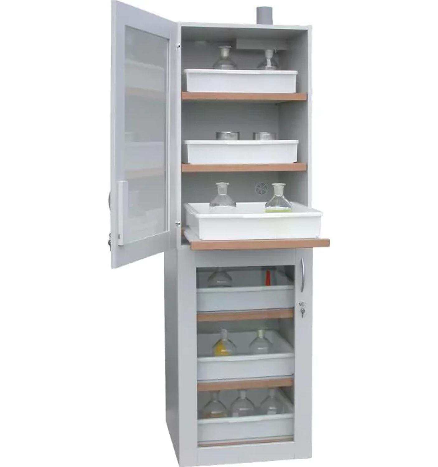 De milieukast SLS 600/4 is een hoge, solide opslagkast voor zuren en logen. Gescheiden opslag door de 2 compartimenten en afzonderlijke deuren. Voorzien van luchtafvoer aan de bovenzijde, aansluitdiameter DN 80. Ventilatieroosters zorgen voor de luchttoevoer. De opslagkast is standaard voorzien van een HPL-coating welke kras en stootbestendig, hygiënisch en duurzaam is. Afgewerkt in de kleur RAL 7035 (lichtgrijs). Voorzien van stelvoeten voor het waterpas stellen van de opslagkast.
